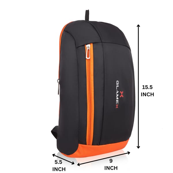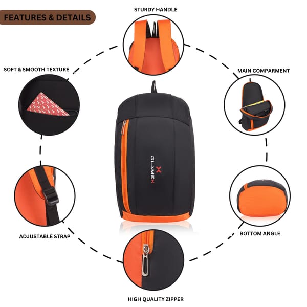 This sleek and modern GLAMEX backpack stands out with its striking black color and vibrant orange accents. Designed for both style and functionality, it features a vertical zipper on the front for easy access to the spacious main compartment.