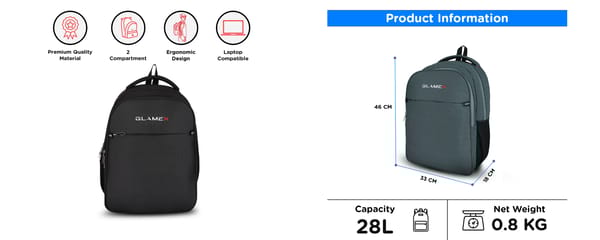 The Glamex Manager Backpack is crafted with an ergonomic design, perfect for busy professionals who value both style and comfort. With a spacious 28L capacity and a dedicated laptop compartment (46 cm x 33 cm), this backpack securely holds all your essentials, while its lightweight build (only 0.8 kg) ensures effortless portability.